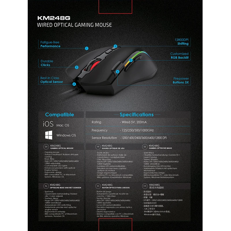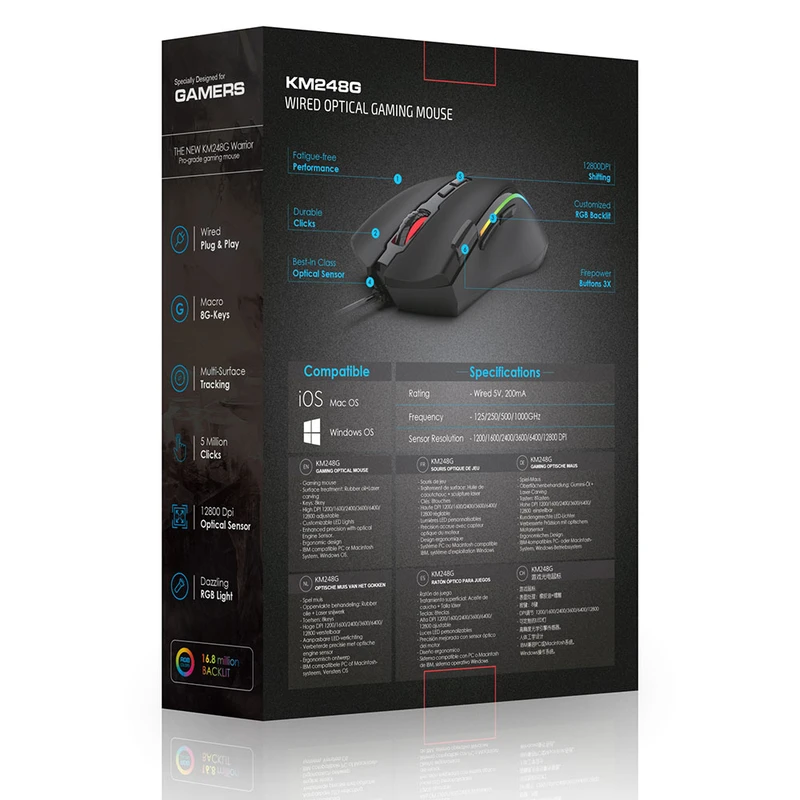 ماوسهای گیمینگ از پرطرفدارترین محصولات کمپانی کینگ استار است که با تکیه بر زیبایی و جذابیت در طراحی به بازار عرضه گردیده است. ماوس گیمینگ کینگ استار مدل KM248G با 180 سانتی متر طول کابل و جنس کنفی آن که از طریق پورت USB به سیستم متصل میگردد، امروزه مورد استفاده کاربران زیادی قرار گرفته است. از مشخصههای فنی این ماوس میتوان به مقدار جریان 200 میلی آمپر و ولتاژ 5 ولت آن هنگام استفاده، اشاره کرد. این محصول دارای 8 کلید و نشانگر LED با 13 طیف رنگی است که مختص گیمرها طراحی شده است. طول عمر این ماوس گیمینگ به 5 میلیون بار کلیک میرسد که از سیستم عاملهای اندورید، لینوکس، ویندوز و مک پشتیبانی میکند. اگر قصد خرید ماوس گیمینگ را دارید به هیچ عنوان از محصولات و ماوسهای گیمینگ کینگ استار غافل نشوید.