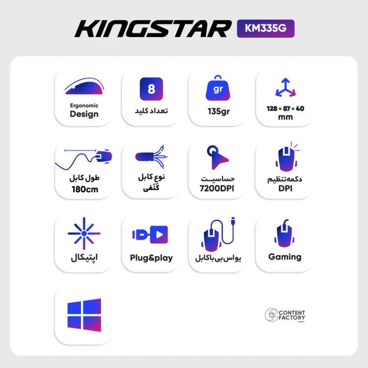 ماوس مخصوص بازی کینگ استار مدل KM335Gبا وزن 135 گرم، در کنار رقبای خود سبک محسوب میشود. این ماوس دارای ابعاد ۱۲۸×۸۷×۴۰ میلیمتر است. تعداد 8 کلید بر روی بدنه خود دارد که قابلیت ضربهپذیری هر کلید 3 میلیون بار کلیک است. قابلیت ضربهپذیری بالای کلیدهای این ماوس ازجمله موارد مهم برای گیمرها بهحساب میآید. این ماوس قابلیت پشتیبانی سیستمعامل ویندوز در نسخههای مختلف را دارد که میتواند پاسخگوی نیاز هر کاربری باشد.