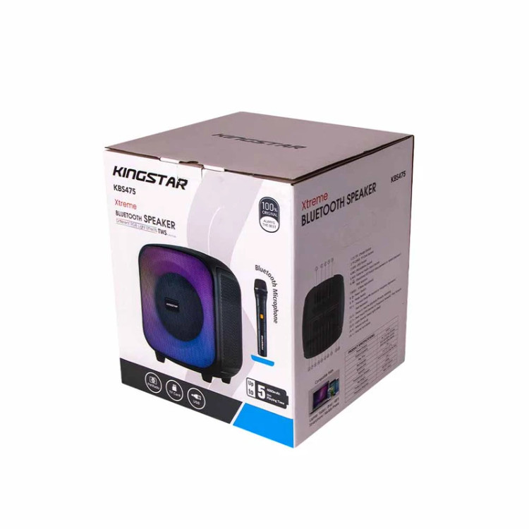 اسپیکر بلوتوثی مدل KBS475 از محصولات جدید کمپانی کینگ استار است. این محصول با ارائهی صدایی دلنشین، تجربهی لذت بخشی از شنیدن موسیقی را برای شما به ارمغان میآورد.از جمله از ویژگیهای بصری اسپیکر بلوتوثی مدل KBS475 میتوان به ابعاد مناسب آن که 264*255*302 میلیمتر و وزن 3.65 کیلوگرمی اشاره کرد. این ابعاد به همراه پنل اختصاصی تنظیم صدا که بالای اسپیکر تعبیه شده، موجب شده تا این محصول تبدیل به یک کالای قابل حمل و جذاب برای رفاه کاربران شود.یکی از مواردی که میشود بعنوان نکته اول در رابطه با محصول KBS475 به آن اشاره کرد در خصوص بلوتوث نسخه 5.3 و محدوده عملکرد 10 متر بکار رفته در آن است که موجب استفاده از این تکنولوژی در فضای باز شده است. نکته دوم در رابطه با وضوح صدای پویا و شفاف آن هنگام پخش موسیقی است که توجه هرکاربری را به خود جلب میکند. این محصول قابلیت پشتیبانی از فلش مموری، کارت حافظه و کابل AUX به همراه پخش رادیو را نیز داراست. علاوه بر موارد گفته شده باید به نکات فنی و تخصصی آن بیشتر توجه داشت. این اسپیکر با یک عدد درایور 6.5 اینچی و یک توییتر 1.5 اینچی، دارای توان خروجی 40 وات است. منبع انرژی این کالا باتری لیتیومی قابل شارژ آن با نرخ 7.4 ولت 4000 میلی آمپر ساعت است. همچنین میزان ورودی شارژ آن 5V/2A است. این محصول با قابلیت پخش موسیقی به اندازه 5 ساعت با میزان صدای 50%، دارای پاسخ فرکانس 50 هرتز تا 19 کیلوهرتز خواهد بود.فناوری True Wireless Stereo یا به اختصار TWS یک راه ارتباطی بر پایه فناوری بلوتوث است که امکان برقراری اتصال بدون سیم دو دستگاه همنام را فراهم کرده است و از آن طریق میتوان صدایی Stereo با دو کانال صوتی چپ و راست را پخش کرد