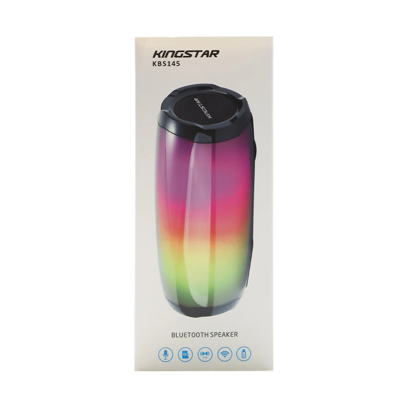 اسپیکر بلوتوثی مدل KBS145 از محصولات جدید کمپانی کینگ استار است. این محصول با ارائه صدایی دلنشین، تجربهی لذت بخشی از شنیدن موسیقی را برای شما به ارمغان میآورد. از جمله از ویژگیهای بصری اسپیکر بلوتوثی مدل KBS145 میتوان به ابعاد مناسب آن که 210*80*80 میلیمتر و وزن 431 گرمی و بیش از 10 نوع تنوع نور RGB اشاره کرد. این ابعاد به همراه دکمههای تغییر موسیقی، حالت موسیقی و تغییر نوع RGB که در روی اسپیکر تعبیه شده، موجب شده تا این محصول تبدیل به یک کالای قابل حمل و جذاب برای رفاه کاربران شود. یکی از مواردی که میشود بعنوان نکته اول در رابطه با محصول KBS145 به آن اشاره کرد در خصوص بلوتوث نسخه 5.3 و محدوده عملکرد 10متر بکار رفته در آن است که موجب استفاده از این تکنولوژی در فضای باز شده است. نکته دوم در رابطه با وضوح صدای پویا و شفاف آن در بخش جلویی اسپیکر هنگام پخش موسیقی است که توجه هرکاربری را به خود جلب میکند. این محصول علاوه بر امکان مکالمه قابلیت پشتیبانی از فلش مموری، کارت حافظه با فرمت FAT 32 و جک 3.5 میلی متری را نیز داراست. علاوه بر موارد گفته شده باید به نکات فنی و تخصصی آن بیشتر توجه داشت. این اسپیکر با 2 درایور 52 میلیمتری، دارای توان خروجی 6 وات است. منبع انرژی این کالا باتری لیتیوم پلیمر داخلی آن با نرخ 3.7 ولت 1200 میلی آمپری است. همچنین میزان حداکثر ورودی و خروجی آن 5V/0.5A است. این محصول با قابلیت پخش موسیقی به اندازه 3 ساعت با میزان صدای 50٪ دارای پاسخ فرکانس 120 هرتز تا 20کیلوهرتز است و در طی زمان 3 ساعت به طور کامل شارژ می شود.فناوری True Wireless Stereo یا به اختصار TWS یک راه ارتباطی بر پایه فناوری بلوتوث است که امکان برقراری اتصال بدون سیم را فراهم کرده است و از آن طریق میتوان صدایی Stereo با دو کانال صوتی چپ و راست را پخش کرد. به کمک این فناوری نیازی به اتصال سیمی بین کانالهای چپ و راست پخش کننده صوت (مانند ایربادز و اسپیکر) نیست و میتوان آنها را از طریق بلوتوث به یکدیگر متصل نمود. برای فعال سازی قابلیت TWS به دفترچه راهنما همراه اسپیکر مراجعه شود