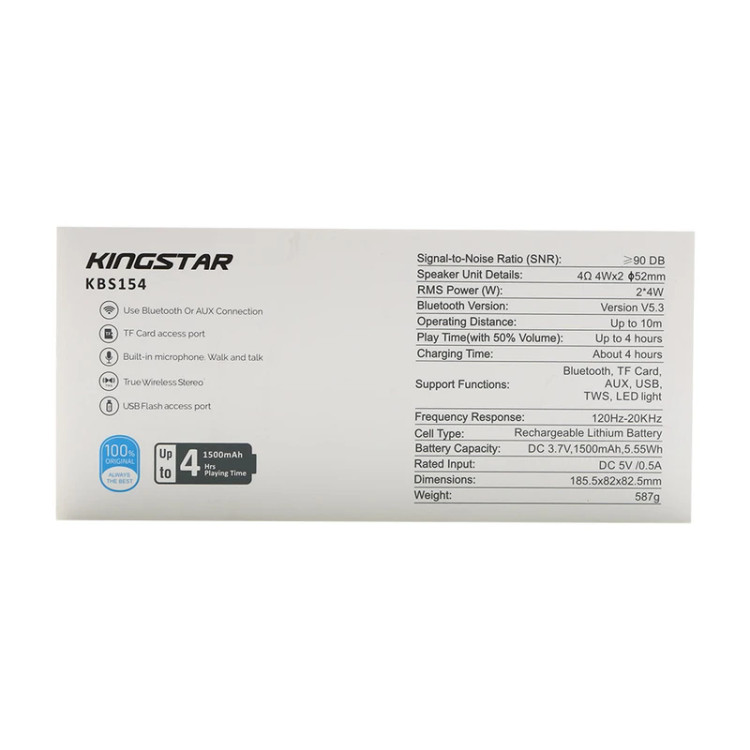 اسپیکر بلوتوثی قابل حمل مدل KBS154 از محصولات جدید کمپانی کینگ استار است. از جمله ویژگیهای بصری این اسپیکر میتوان به بدنه پلاستیکی به ابعاد 82*82*185 میلیمتر و وزن 590 گرمی در کنار نوپردازی RGB آن اشاره کرد. این ابعاد در کنار بند موجود در پشت اسپیکر موجب شده تا این محصول تبدیل به یک کالای قابل حمل و جذاب شود. در قسمت بالایی این اسپیکر 5 دکمه بزرگ تعبیه شده که شامل دکمه خاموش و روشن، کاهش و افزایش صدا، تغییر مود و تغییر نورپردازی است. همچنین در قسمت پشتی آن با کنار زدن پوشش لاستیکی، درگاه Type-C جهت شارژ اسپیکر و ورودی های کارت حافظه MicroSD (با فرمت FAT32)، درگاه USB (با فرمت FAT32) و جک 3.5 میلی متری را مشاهده خواهید نمود. KBS154 در 3 رنگ قرمز، مشکی و سرمه ای، دارای 10 مدل نورپردازی متفاوت نیز میباشد. وجود استند موبایل از خلاقیت های جذاب در طراحی این اسپیکر بوده و میتوانید همزمان با پخش صدا از اسپیکر، تصویر را هم در گوشی یا تبلت خود مشاهده نمائید. در تشریح ویژگی های داخلی محصول، میتوان به وجود 2 بلند گوی 4 واتی (در مجموع 8 وات توان خروجی) با قطر 52 میلی متر و مقاومت 4 اهمی اشاره کرد. همچنین بلوتوث نسخه 5.3 با محدوده عملکرد 10 متر، امکان استفاده از این تکنولوژی در فضای باز را به ما میدهد. وضوح صدای پویا و شفاف در بخش جلویی اسپیکر هنگام پخش موسیقی، توجه هر کاربری را به خود جلب میکند. وجود میکروفون و قابلیت مکالمه از طریق اسپیکر از دیگر ویژگی های این محصول میباشد. مدت زمان پخش اسپیکر با صدای 50 درصد بیش از 4 ساعت بوده و مدت زمان مورد نیاز جهت شارژ اسپیکر از صفر تا صد حدود 4 ساعت میباشد. منبع انرژی این کالا باتری لیتیومی 3.7 ولت 1500 میلی آمپری است. فناوری True Wireless Stereo یا به اختصار TWS یک راه ارتباطی بر پایه فناوری بلوتوث است که امکان برقراری اتصال بدون سیم را فراهم کرده است و از آن طریق میتوان صدایی Stereo با دو کانال صوتی چپ و راست را پخش کرد. این قابلیت در اسپیکر KBS154 موجب پرطرفدار شدن آن شده است. جهت فعال سازی قابلیت TWS به دفترچه راهنما همراه محصول مراجعه شود. در نگاه تخصصی تر، این اسپیکر با نسبت سیگنال به نویز 90 دسی بل و پاسخ فرکانسی 120Hz-20KHz از اسپیکر های با کیفیت بازار به شمار میآید. همچنین میزان حداکثر ورودی شارژ آن 5V/0.5A است.