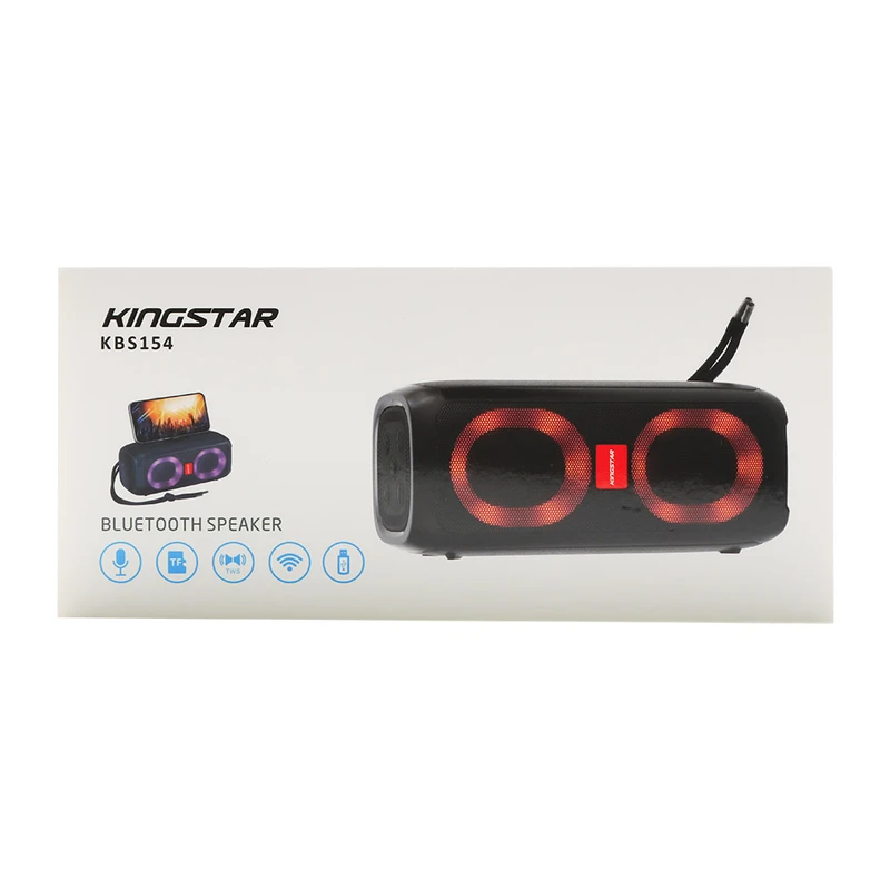 اسپیکر بلوتوثی قابل حمل مدل KBS154 از محصولات جدید کمپانی کینگ استار است. از جمله ویژگیهای بصری این اسپیکر میتوان به بدنه پلاستیکی به ابعاد 82*82*185 میلیمتر و وزن 590 گرمی در کنار نوپردازی RGB آن اشاره کرد. این ابعاد در کنار بند موجود در پشت اسپیکر موجب شده تا این محصول تبدیل به یک کالای قابل حمل و جذاب شود. در قسمت بالایی این اسپیکر 5 دکمه بزرگ تعبیه شده که شامل دکمه خاموش و روشن، کاهش و افزایش صدا، تغییر مود و تغییر نورپردازی است. همچنین در قسمت پشتی آن با کنار زدن پوشش لاستیکی، درگاه Type-C جهت شارژ اسپیکر و ورودی های کارت حافظه MicroSD (با فرمت FAT32)، درگاه USB (با فرمت FAT32) و جک 3.5 میلی متری را مشاهده خواهید نمود. KBS154 در 3 رنگ قرمز، مشکی و سرمه ای، دارای 10 مدل نورپردازی متفاوت نیز میباشد. وجود استند موبایل از خلاقیت های جذاب در طراحی این اسپیکر بوده و میتوانید همزمان با پخش صدا از اسپیکر، تصویر را هم در گوشی یا تبلت خود مشاهده نمائید. در تشریح ویژگی های داخلی محصول، میتوان به وجود 2 بلند گوی 4 واتی (در مجموع 8 وات توان خروجی) با قطر 52 میلی متر و مقاومت 4 اهمی اشاره کرد. همچنین بلوتوث نسخه 5.3 با محدوده عملکرد 10 متر، امکان استفاده از این تکنولوژی در فضای باز را به ما میدهد. وضوح صدای پویا و شفاف در بخش جلویی اسپیکر هنگام پخش موسیقی، توجه هر کاربری را به خود جلب میکند. وجود میکروفون و قابلیت مکالمه از طریق اسپیکر از دیگر ویژگی های این محصول میباشد. مدت زمان پخش اسپیکر با صدای 50 درصد بیش از 4 ساعت بوده و مدت زمان مورد نیاز جهت شارژ اسپیکر از صفر تا صد حدود 4 ساعت میباشد. منبع انرژی این کالا باتری لیتیومی 3.7 ولت 1500 میلی آمپری است. فناوری True Wireless Stereo یا به اختصار TWS یک راه ارتباطی بر پایه فناوری بلوتوث است که امکان برقراری اتصال بدون سیم را فراهم کرده است و از آن طریق میتوان صدایی Stereo با دو کانال صوتی چپ و راست را پخش کرد. این قابلیت در اسپیکر KBS154 موجب پرطرفدار شدن آن شده است. جهت فعال سازی قابلیت TWS به دفترچه راهنما همراه محصول مراجعه شود. در نگاه تخصصی تر، این اسپیکر با نسبت سیگنال به نویز 90 دسی بل و پاسخ فرکانسی 120Hz-20KHz از اسپیکر های با کیفیت بازار به شمار میآید. همچنین میزان حداکثر ورودی شارژ آن 5V/0.5A است.