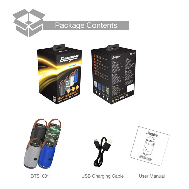 اسپیکر بلوتوث BTS103 از دیگر محصولاتی است که به تازگی توسط کمپانی انرجایزر به بازار عرضه شده است. این اسپیکربلوتوث که به صورت یک استوانه طراحی شده است از همین دست اسپیکرها است. طراحان این مدل همزان راحتی کاربری و زیبایی را در آن پیاده کرده اند در راستای بالا بردن رابط کاربری محصول با قرار دادن یک بند چرم به فکر راحتی حمل و نقل آن بوده اند. همچنین مدل ایستاده آن باعث میشود این محصول هنگامی که بر روی میز قرار میگیرد، جای کمی بگیرد. بر روی اسپیکر یک روکش پارچهای با تنوع رنگی بالا و طرح خاص ارتشی با الهام از طبیعت و جنگل استفاده شده است. در قسمت انتهایی آن روکش فلزی استفاده شده است تا آسیبی به اسپیکر وارد نشود همینطور دکمههای کم و زیاد و جستجو و پاور در قسمت جلویی این بخش و پورت های USB ،AUX و ورودی کارت میکرو و درگاه شارژ MicroUSB در قسمت پشتی آن است. کمپانی انرجایزر در استفاده از این محصول کاملا دست شما را باز گذاشتهاند و با ایجاد تمامی امکانات در آن تلاش نمودهاند تا محصولی زیبا و بینقص را به بازار عرضه دارند.