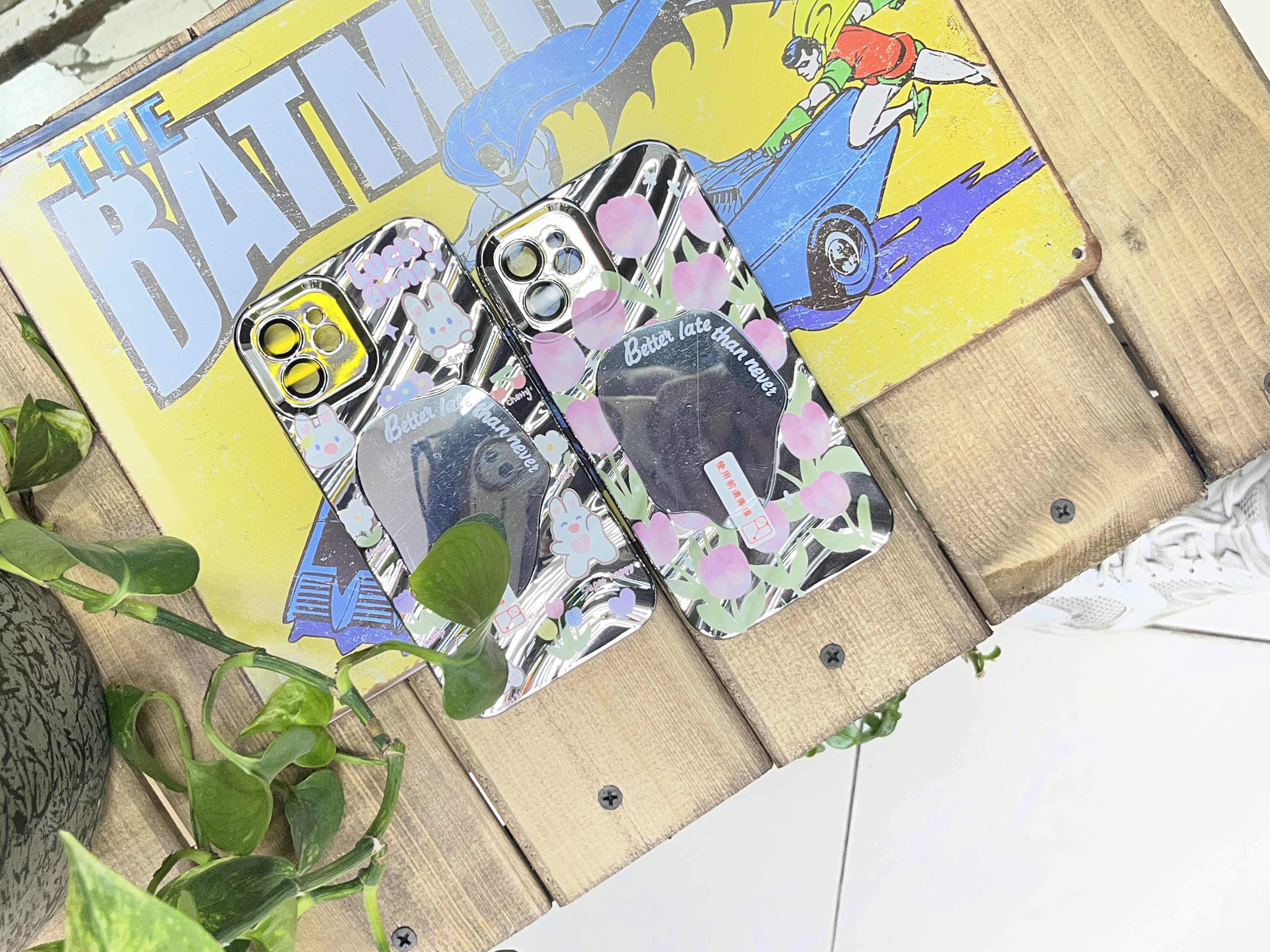 قاب آیفون ۱۲ آینهای فانتزی دخترانه با طرح خرگوش و گل لاله، شیک، سبک و مقاوم، مناسب استفاده روزانه و هدیه.